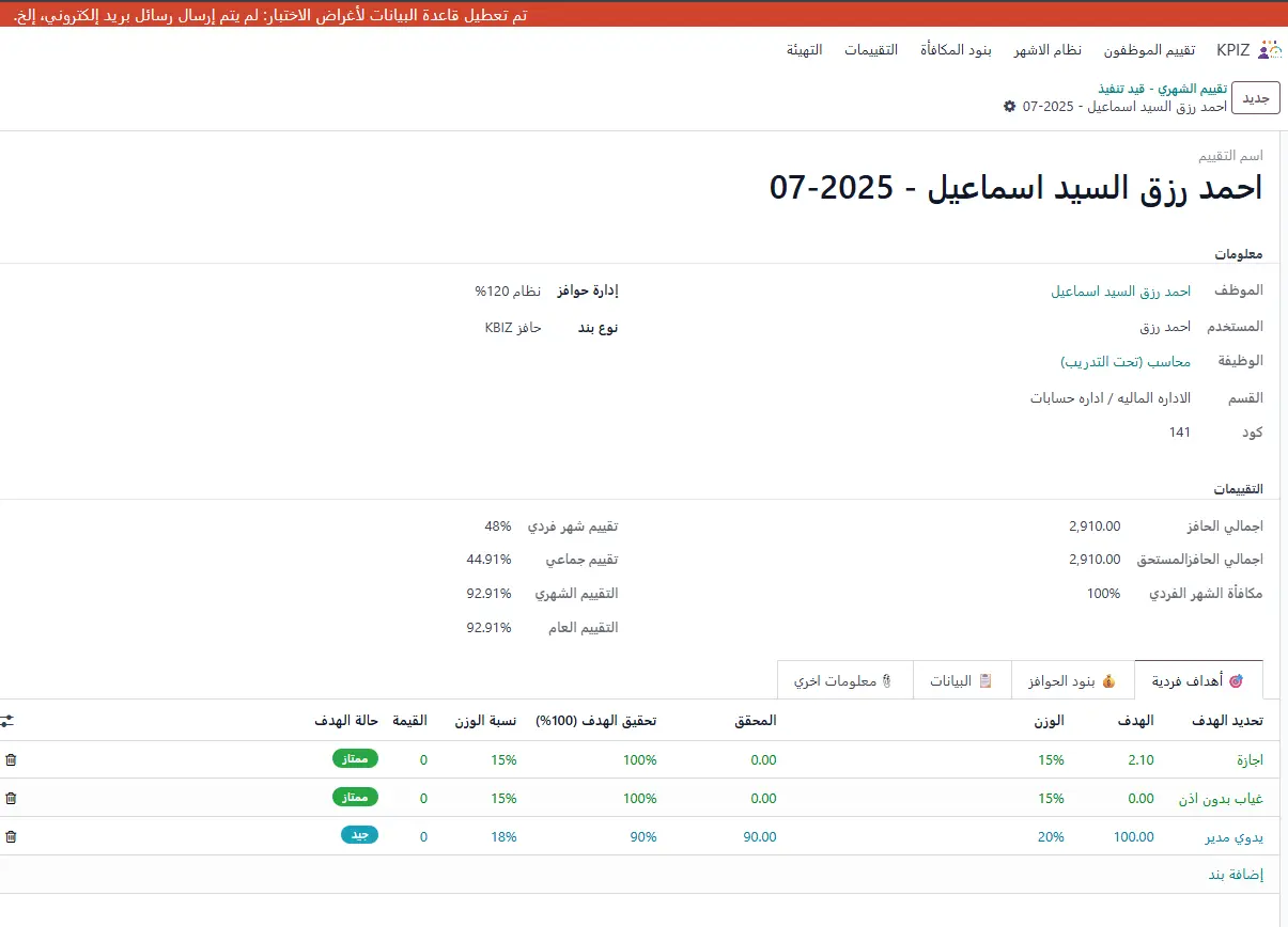 من خلال الموديول ده، هتقدر تدير تقييمات الموظفين بدقة وسهولة. تقدر تحدد الأهداف، تتابع أداء كل موظف، وتستلم تقارير وتحليلات شاملة عن التقدم. هدفنا إنك تحسن الأداء، تكافئ المتميزين، وتبني فريق أقوى بأقل مجهود.